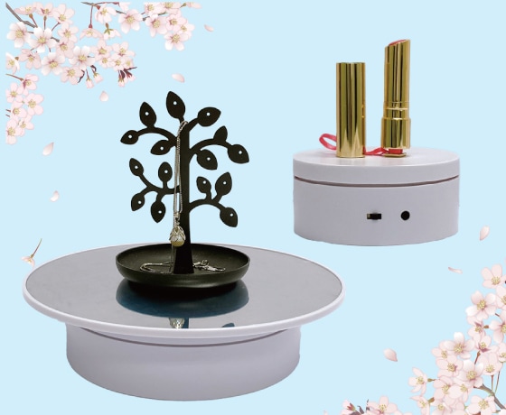 360度回転で商品を魅力的に演出し、化粧品やアクセサリーの展示・撮影にも活躍します。